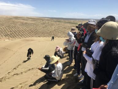 2018级资源环境专业、2018级地理科学专业、2017级地理信息专业、2019级地理信息专业同学认真听取了治沙站杨恒华副站长对治沙试验站的介绍。随后2018资环专业和2018级地科专业同学在陈宗颜、安福元等老师的带领下进入沙珠玉沙漠,对沙漠地貌、沙漠植被、沙漠气候进行了调查,分析了共和盆地气候变化与人类活动对荒漠化的影响,同学们在老师的讲解和自己的观察中对防沙治沙的原理有了深刻的认识。