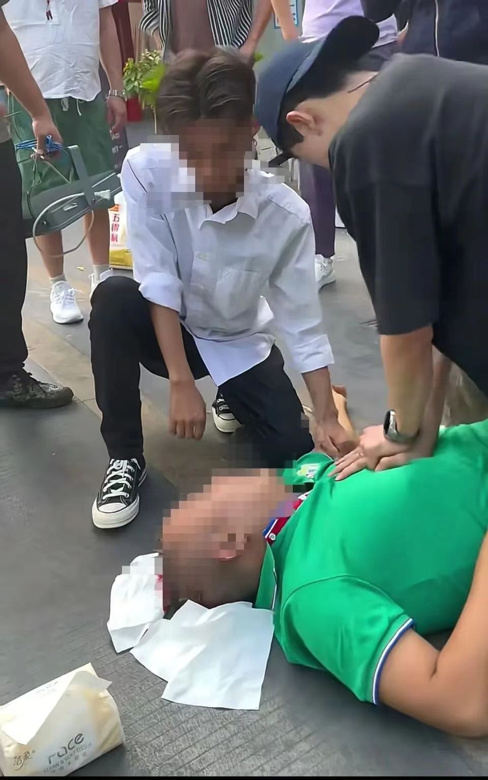 2025年2月20日下午16时32分左右,马海生同学途经三亚市天涯区海之眼商业区余穆兰州拉面店门口时,发现一名年轻男子(后核实为附近水果店小工)突发晕厥倒地,后脑着地,流血不止,面色苍白、呼吸微弱,现场无专业医护人员,围观群众虽有担忧却因缺乏急救知识而手足无措,场面十分紧急。