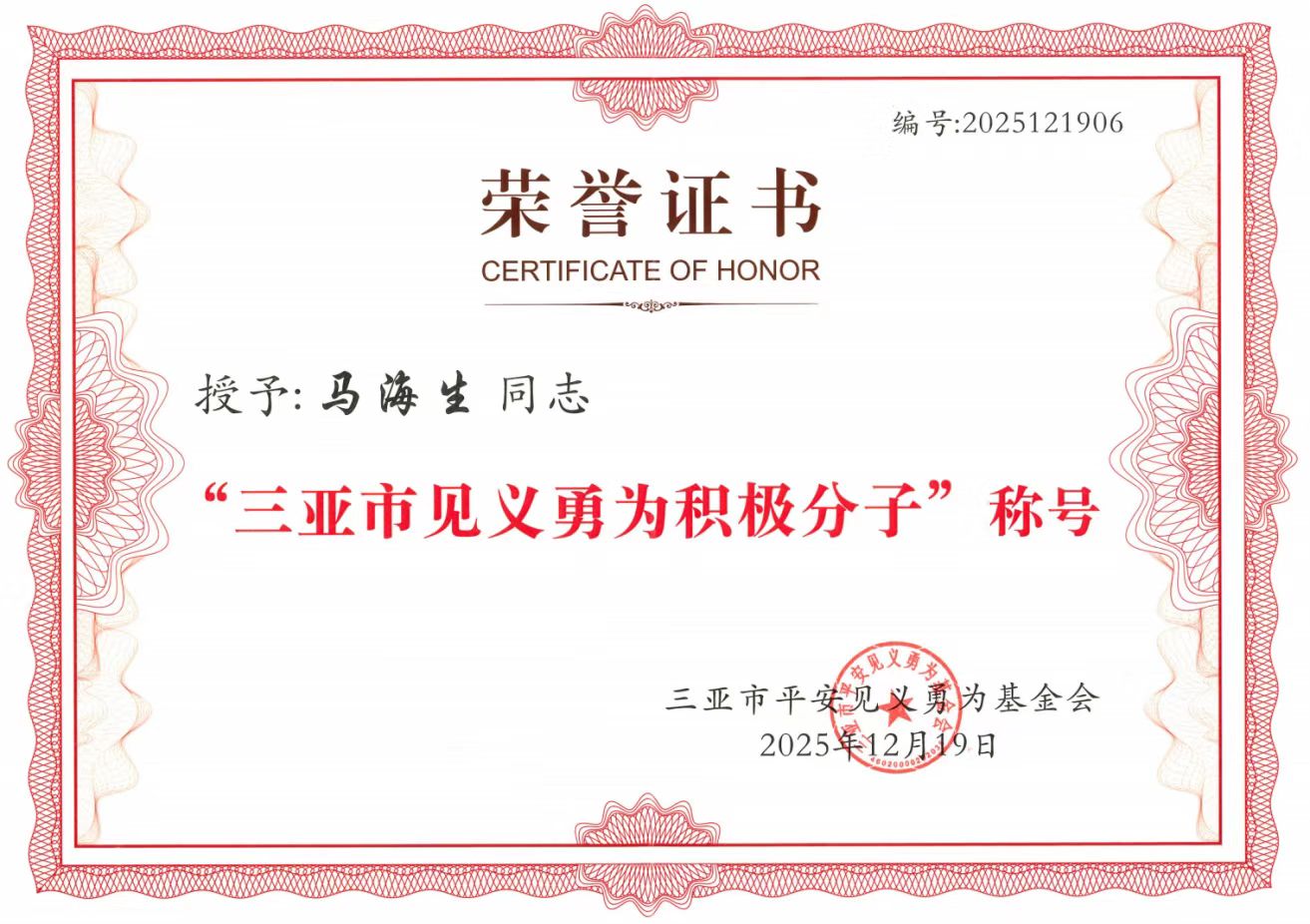 学子的良好精神风貌。近日,马海生同学被三亚市平安见义勇为基金会授予“三亚市见义勇为积极分子”荣誉称号。